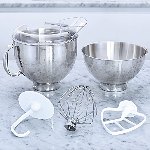 Il n’inclut pas les accessoires que vous mentionnez. Il peut venir dans un modèle supérieur, mais celui-ci ne l’apporte pas. Il apporte deux bols (grands et petits), et les trois crochets de base, en acier inoxydable l’assembleur et émaillé les deux pétrins.