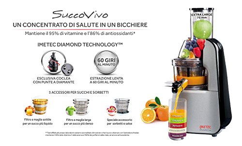 IMETEC Succo Vivo est une centrifugeuse équipée de la meilleure technologie italienne, pour obtenir des boissons fraîches et saines, avec toutes les propriétés des fruits et légumes.
